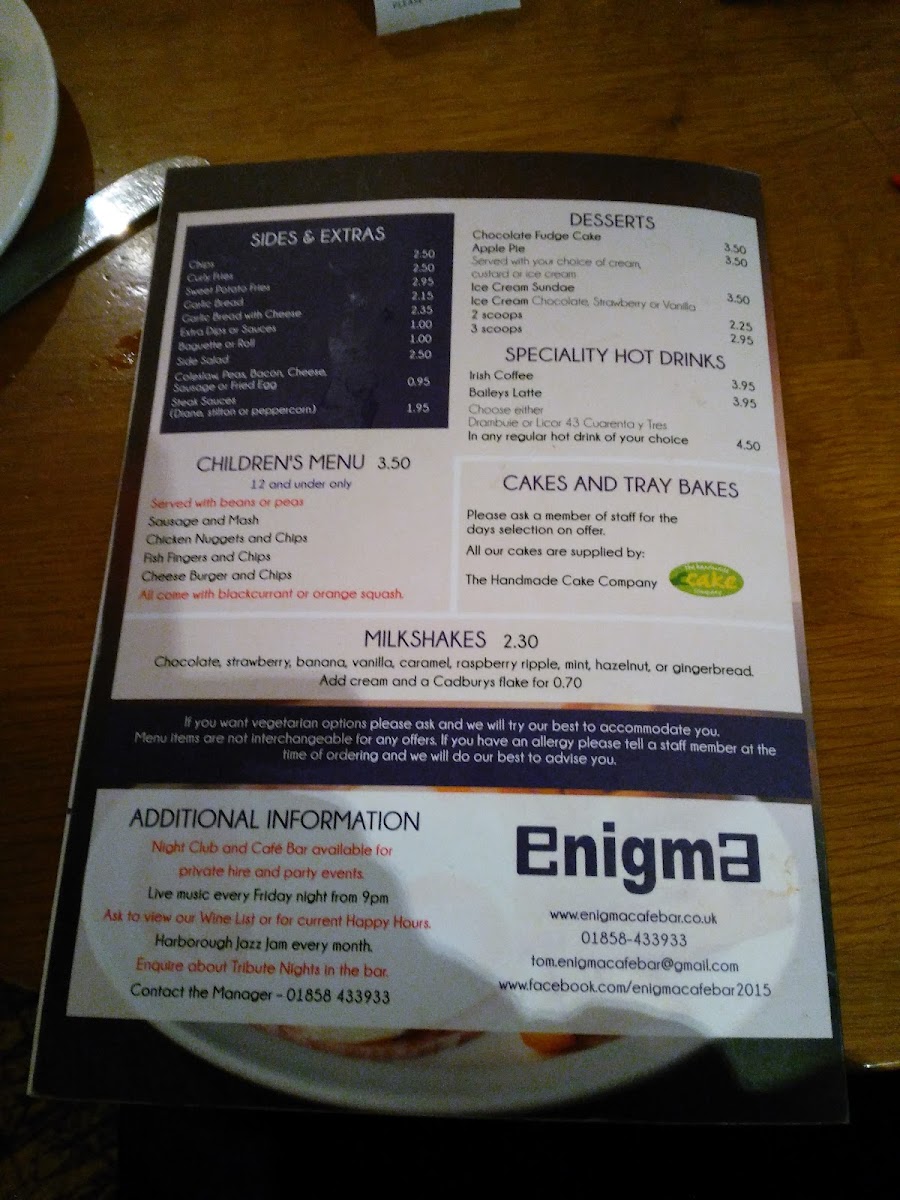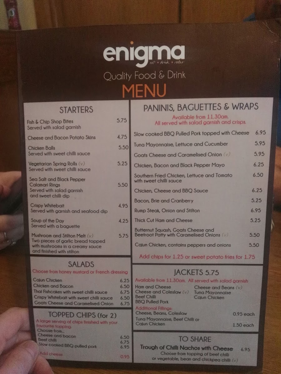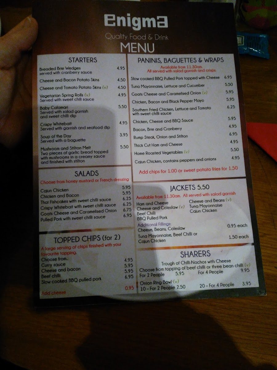 From a reviewer’s perspective, the menu at Enigma Market Harborough offers a well-rounded and approachable dining experience that balances comfort food with crowd-pleasing variety. The Starters set the tone nicely, with options like Fish & Chip Shop Bites, Cheese And Bacon Potato Skins, Chicken Balls, Vegetarian Spring Rolls, and Sea Salt And Black Pepper Calamari Rings, making it easy to begin with something familiar yet satisfying. The Salads section adds freshness and contrast, from Cajun Chicken and Chicken And Bacon to Crispy Whitebait With Sweet Chilli Sauce and Goats Cheese And Caramelised Onion, appealing to both lighter appetites and flavour seekers. Moving on to Paninis, Baguettes & Wraps, hearty choices such as Slow Cooked BBQ Pulled Pork Topped With Cheese and Goats Cheese And Caramelised Onion reinforce the kitchen’s focus on rich, comforting flavours. For sharing, the Trough Of Chilli Nachos With Cheese is a sociable highlight, ideal for groups. Families are well catered for with a clear Children’s Menu, including Sausage And Mash, Chicken Nuggets And Chips, Fish Fingers And Chips, and Cheese Burger And Chips. Desserts like Chocolate Fudge Cake, Apple Pie, and Ice Cream Sundae provide a classic, satisfying finish, while Speciality Hot Drinks such as Irish Coffee and Balleys Latte add a cosy touch. Complemented by Sides & Extras like Chips, Curly Fries, Sweet Potato Fries, Garlic Bread, and Garlic Bread With Cheese, alongside additional comfort dishes including Ham And Cheese, Cheese And Beans, Onion Ring Bowl, Syrup Sponge Pudding, and Chocolate Melt In The Middle Pudding, the menu comes together as a dependable, generous offering that suits casual meals, family dining, and relaxed social occasions alike.