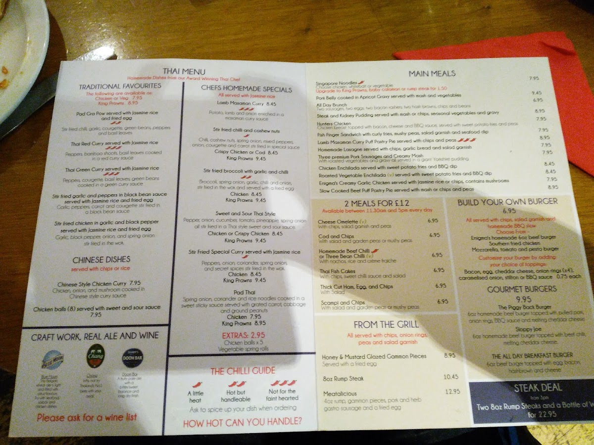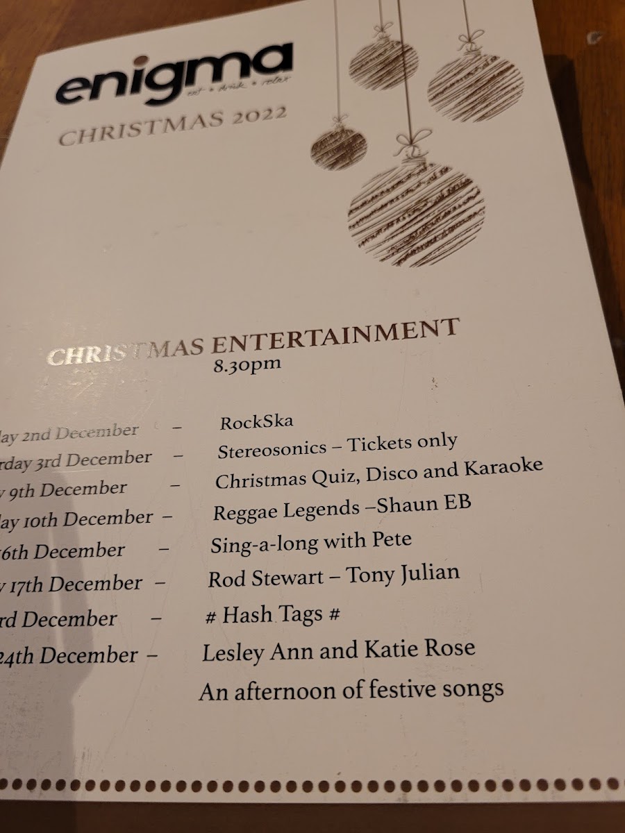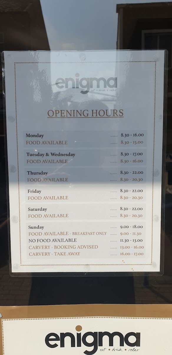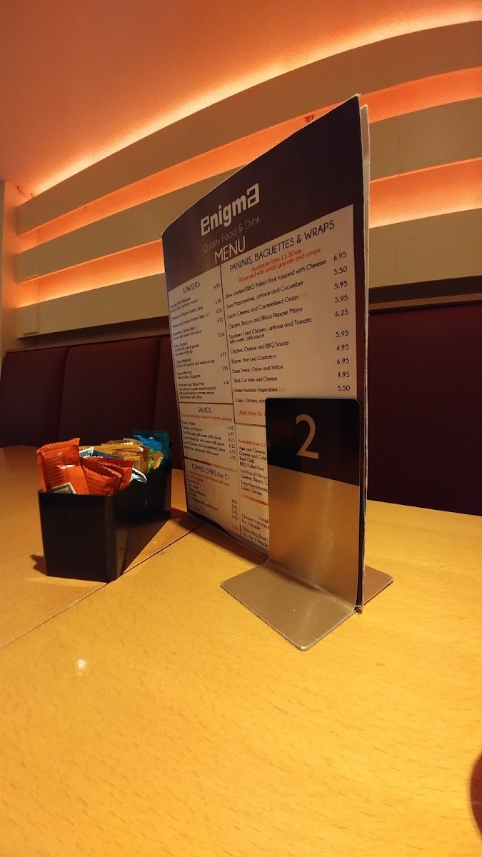 From a reviewer’s perspective, the menu at Enigma Market Harborough offers a well-rounded and approachable dining experience that balances comfort food with crowd-pleasing variety. The Starters set the tone nicely, with options like Fish & Chip Shop Bites, Cheese And Bacon Potato Skins, Chicken Balls, Vegetarian Spring Rolls, and Sea Salt And Black Pepper Calamari Rings, making it easy to begin with something familiar yet satisfying. The Salads section adds freshness and contrast, from Cajun Chicken and Chicken And Bacon to Crispy Whitebait With Sweet Chilli Sauce and Goats Cheese And Caramelised Onion, appealing to both lighter appetites and flavour seekers. Moving on to Paninis, Baguettes & Wraps, hearty choices such as Slow Cooked BBQ Pulled Pork Topped With Cheese and Goats Cheese And Caramelised Onion reinforce the kitchen’s focus on rich, comforting flavours. For sharing, the Trough Of Chilli Nachos With Cheese is a sociable highlight, ideal for groups. Families are well catered for with a clear Children’s Menu, including Sausage And Mash, Chicken Nuggets And Chips, Fish Fingers And Chips, and Cheese Burger And Chips. Desserts like Chocolate Fudge Cake, Apple Pie, and Ice Cream Sundae provide a classic, satisfying finish, while Speciality Hot Drinks such as Irish Coffee and Balleys Latte add a cosy touch. Complemented by Sides & Extras like Chips, Curly Fries, Sweet Potato Fries, Garlic Bread, and Garlic Bread With Cheese, alongside additional comfort dishes including Ham And Cheese, Cheese And Beans, Onion Ring Bowl, Syrup Sponge Pudding, and Chocolate Melt In The Middle Pudding, the menu comes together as a dependable, generous offering that suits casual meals, family dining, and relaxed social occasions alike.